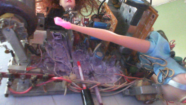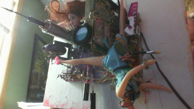 Year after year of doing art, I wanted to kick down a new habit and a new passion. Let’s just say I went a bit nutty by hammering into a television and yanking the head off this poor doll. I never did the 3D thing or the “mixed media” until this year and I have zero clue as to why I let this happen! This is Bombshell Covergirl. I plan on doing about three pieces in the next few months. Please kick down some of your found art pretty please, I have more fun if other artists join together and share ideas. Tah tah for now. Breathe and break something now…makes your day much more exciting.
